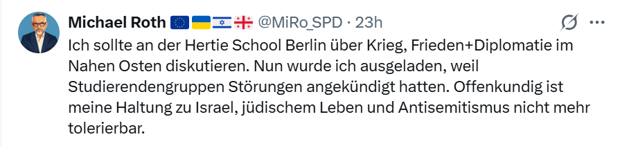 Der deutsche Politologe und Bundestagspolitiker Michael Roth (SPD) sollte ursprünglich am 28. April an der Hertie School in Berlin über Krieg, Frieden und Diplomatie im Nahen Osten sprechen. Nun gibt er jedoch bekannt, dass er ausgeladen worden sei, nachdem Studierendengruppen Störungen angekündigt hatten. Auf X schreibt er: