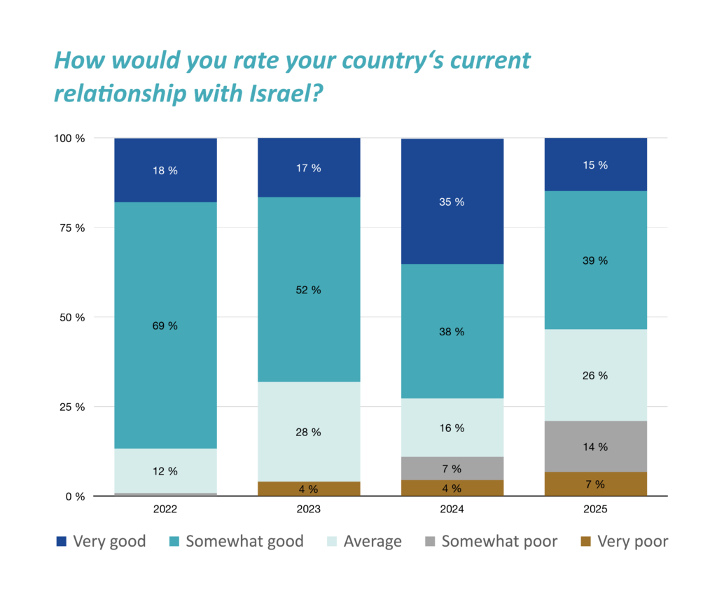 Zwar ist der Anteil derjenigen gestiegen, die das Verhältnis ihres Landes zu Israel als schlecht oder sehr schlecht bewerten, während der Anteil derjenigen, die es als gut einschätzen, zurückgegangen ist. Gleichzeitig bleibt die Bereitschaft zur Zusammenarbeit insgesamt hoch: 68 Prozent der Befragten geben 2025 an, eine intensivere Zusammenarbeit mit Israel zu wünschen – ein Rückgang gegenüber 81 Prozent im Jahr 2022.