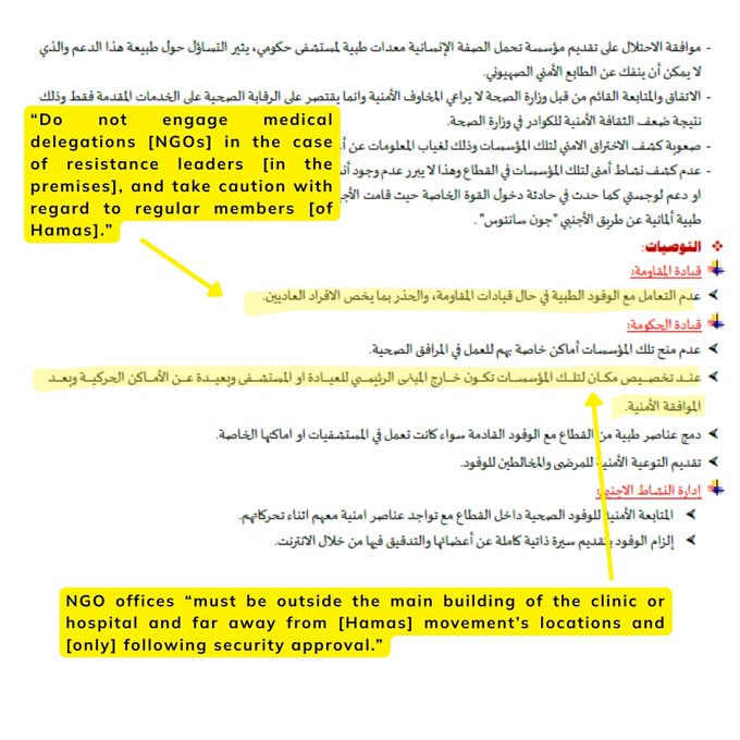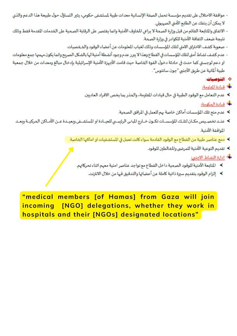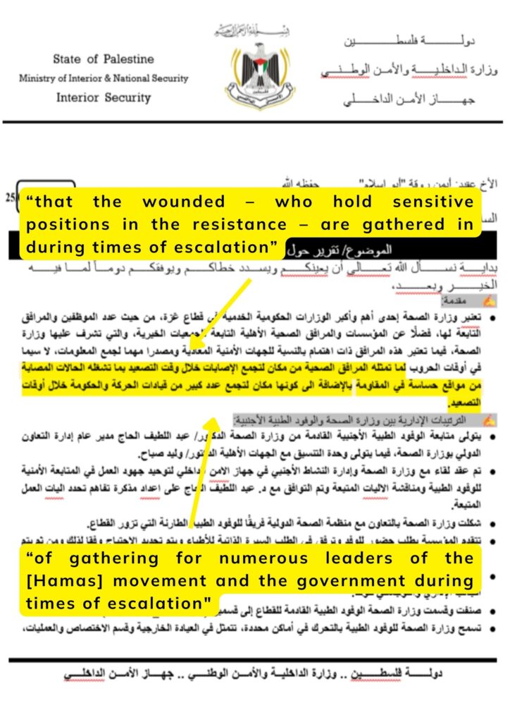 „Die internen Hamas-Dokumente, die in diesem Bericht geprüft wurden, offenbaren eine systematische Hamas-Strategie zur Militarisierung des Gesundheitswesens in Gaza, indem Krankenhäuser und medizinische Einrichtungen als Verlängerungen des militärischen und sicherheitsbezogenen Apparats des Gebiets genutzt werden. Medizinische Zentren in Gaza sind nicht bloss Behandlungsstätten, sondern fungieren vielmehr als Knotenpunkte der Hamas-Führung, als Sammelpunkte für Einsatzkräfte, als sichere Zonen für verwundete Terroristen und als Orte für geschützte Kommunikationsinfrastruktur. Um diese Operationen zu schützen, führt Hamas eine strenge Kontrolle über das Personal ausländischer medizinischer NGOs und internationaler Agenturen ein, beschränkt deren Zugang, überwacht ihr Personal und zwingt sie, unter den Sicherheitsdirektiven der Hamas zu operieren. Diese Ordnung ist grundsätzlich unvereinbar mit dem Prinzip der medizinischen Neutralität in Gaza und verwandelt humanitäre Bereiche in Einrichtungen mit Doppelverwendung, die sowohl medizinischen als auch militärischen Zwecken dienen.“